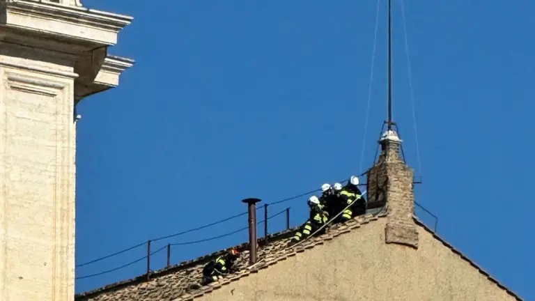 La noticia fue compartida a través de la cuenta de X de Vatican News, donde se observa a los bomberos en el tejado de la Capilla Sixtina instalando la chimenea.
