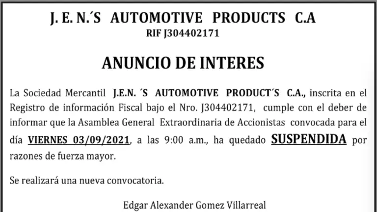 ANUNCIO DE INTERES | J.E.N ‘S AUTOMOTIVE PRODUCT’S C.A