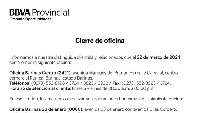 BBVA PROVINCIAL | CIERRE DE OFICINA BARINAS CENTRO