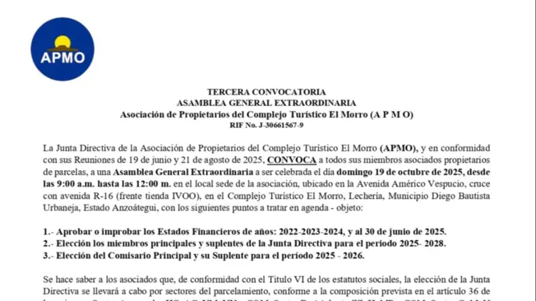 CONVOCATORIA ASOCIACIÓN CIVIL DE PROPIETARIOS DEL COMPLEJO TURÍSTICO EL MORRO (APMO) 9 OCT 20259 OCT 2025
