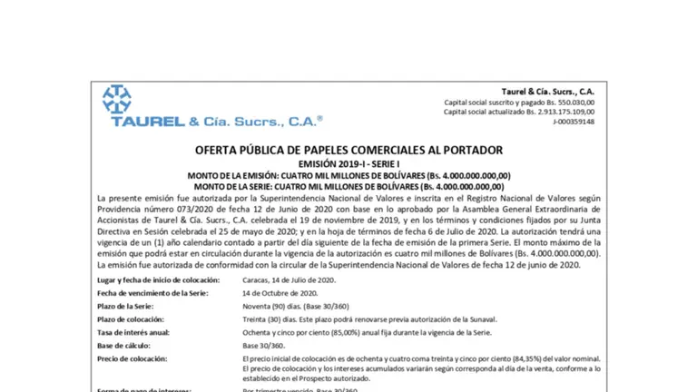 Oferta Pública | Taurel & Cía. Scrs., C.A.