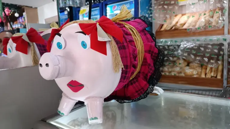Es una cochinita llamada Carla, sencilla, con luces, montada sobre una caja de regalo, con un chaleco azul y lazos; y cuando recibe dinero suena un timbre y los empleados gritan, “gracias”, detalló.
