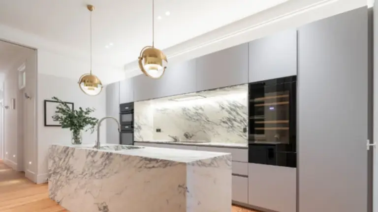 Planificar la iluminación es crucial en una cocina elegante. Las luces empotradas en el techo proporcionan una iluminación general suave, mientras que las lámparas colgantes sobre la isla central actúan como puntos focales que añaden un toque de glamour. Además, la iluminación debajo de los gabinetes no solo es funcional, sino que también resalta la belleza de los materiales utilizados.